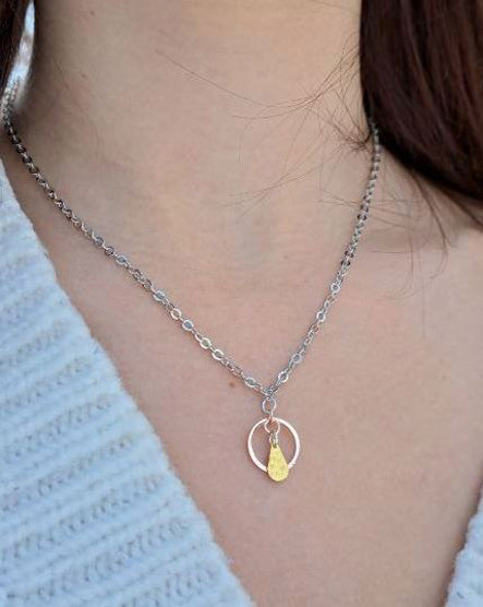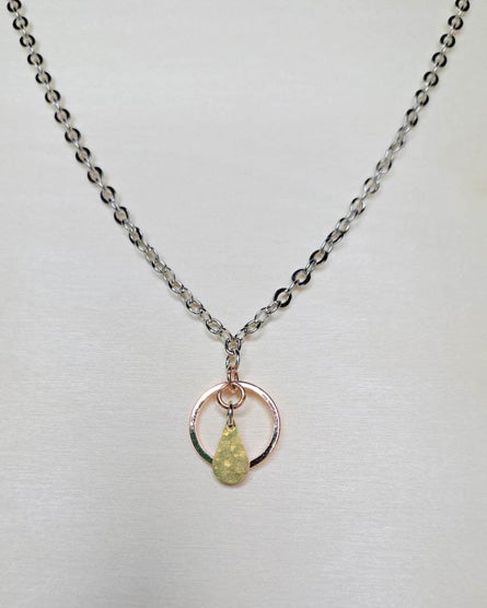 The Circle Necklace features a sleek rose gold circle, beautifully paired with a textured raw brass teardrop, all suspended from a delicate silver chain. This piece is a perfect fusion of geometric shapes and textures, adding an elegant yet modern touch to your style.