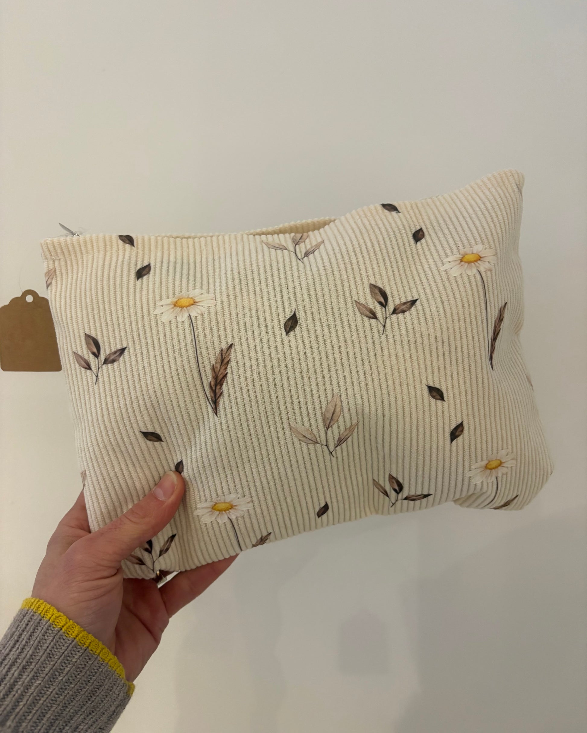 A corduroy cosmetic bag with cute daisy and leaves on the front. This bag provides generous space to store all your essentials from makeup to face wash and lotion to jewelry, these bags have you covered with both functionality and sophistication.