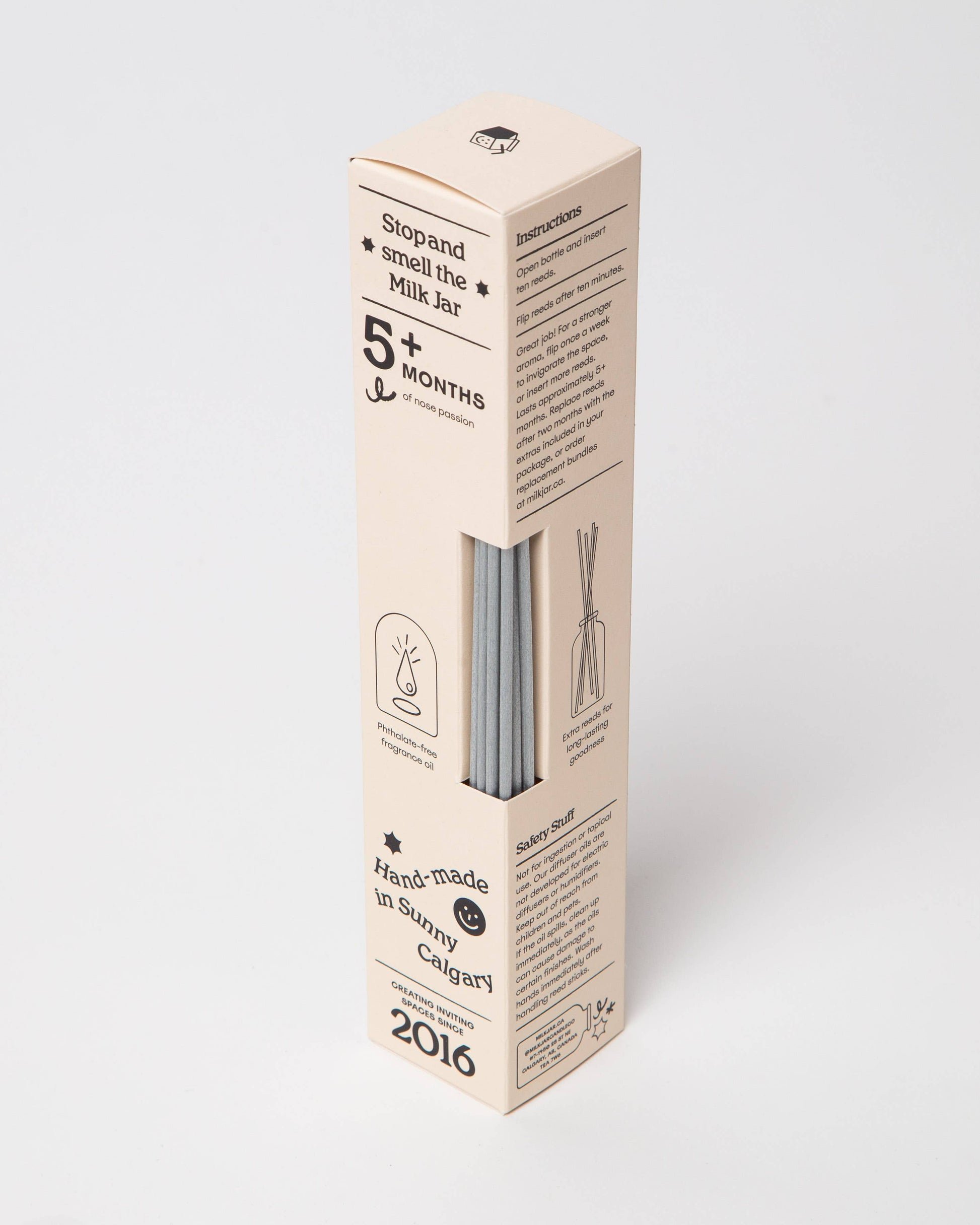 - Glass bottle. Size: 4oz | 1.75 x 1.75 x 10” with reeds.