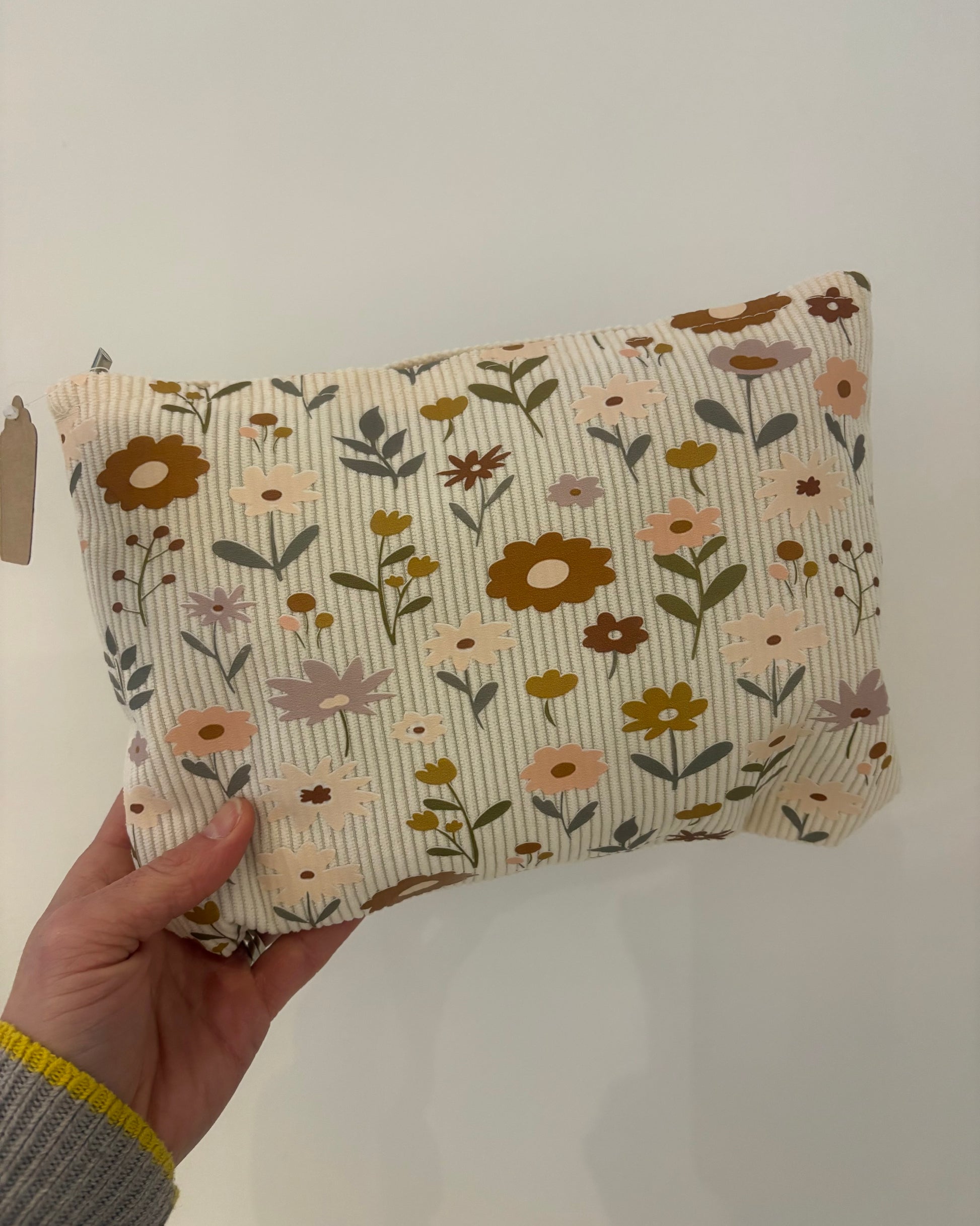 A corduroy cosmetic bag with gorgeous neutral colored flowers on the front. This bag provides generous space to store all your essentials from makeup to face wash and lotion to jewelry, these bags have you covered with both functionality and sophistication.