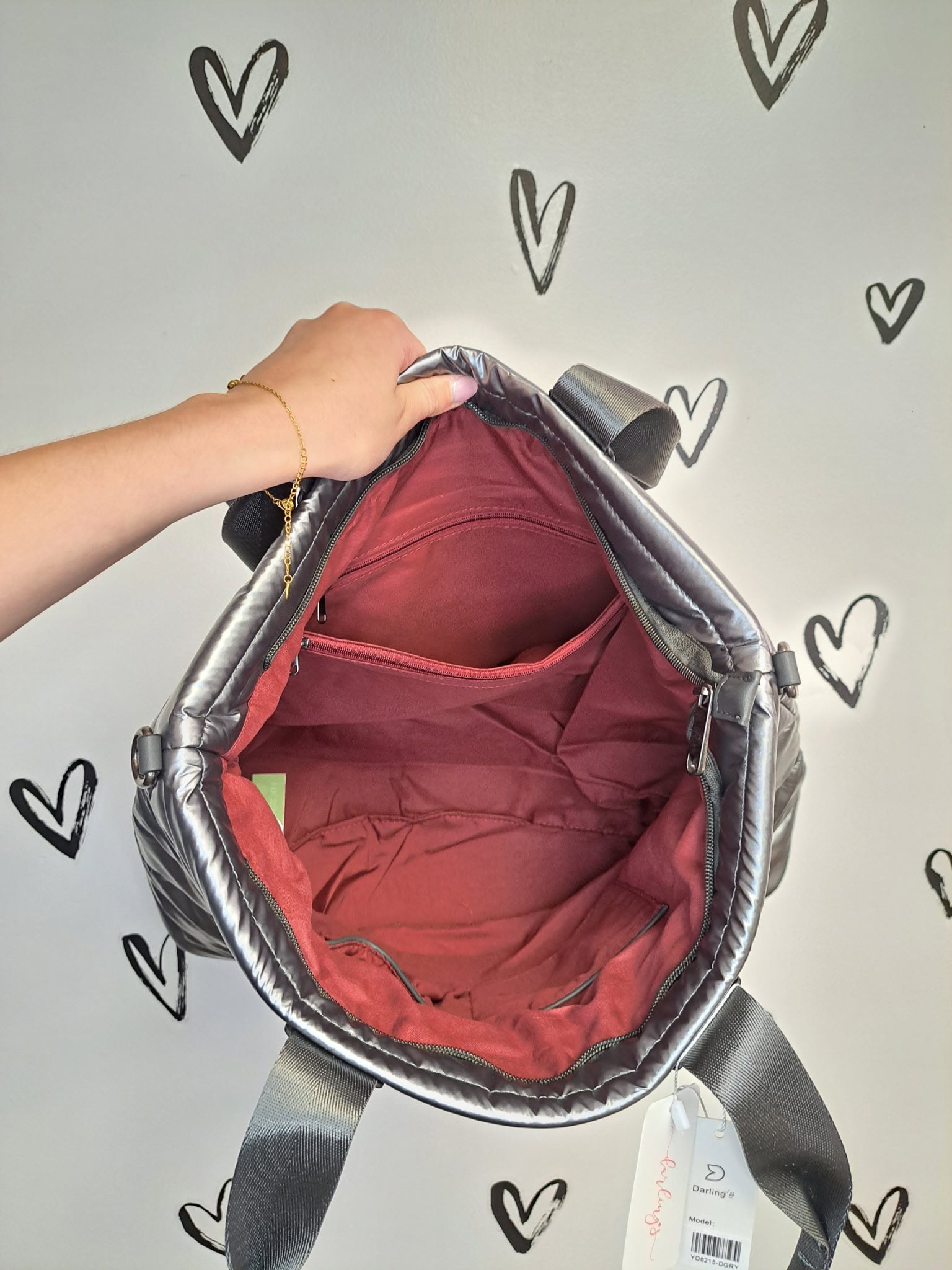 - Top zipper closure with inner pockets.