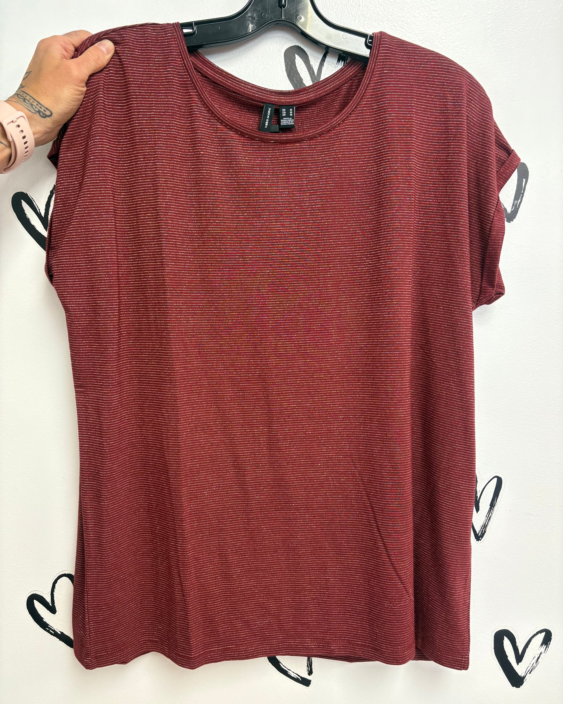 Features: Comfy, relaxed fit t-shirt with mini sleeve cuffs, and a subtle striped pattern.