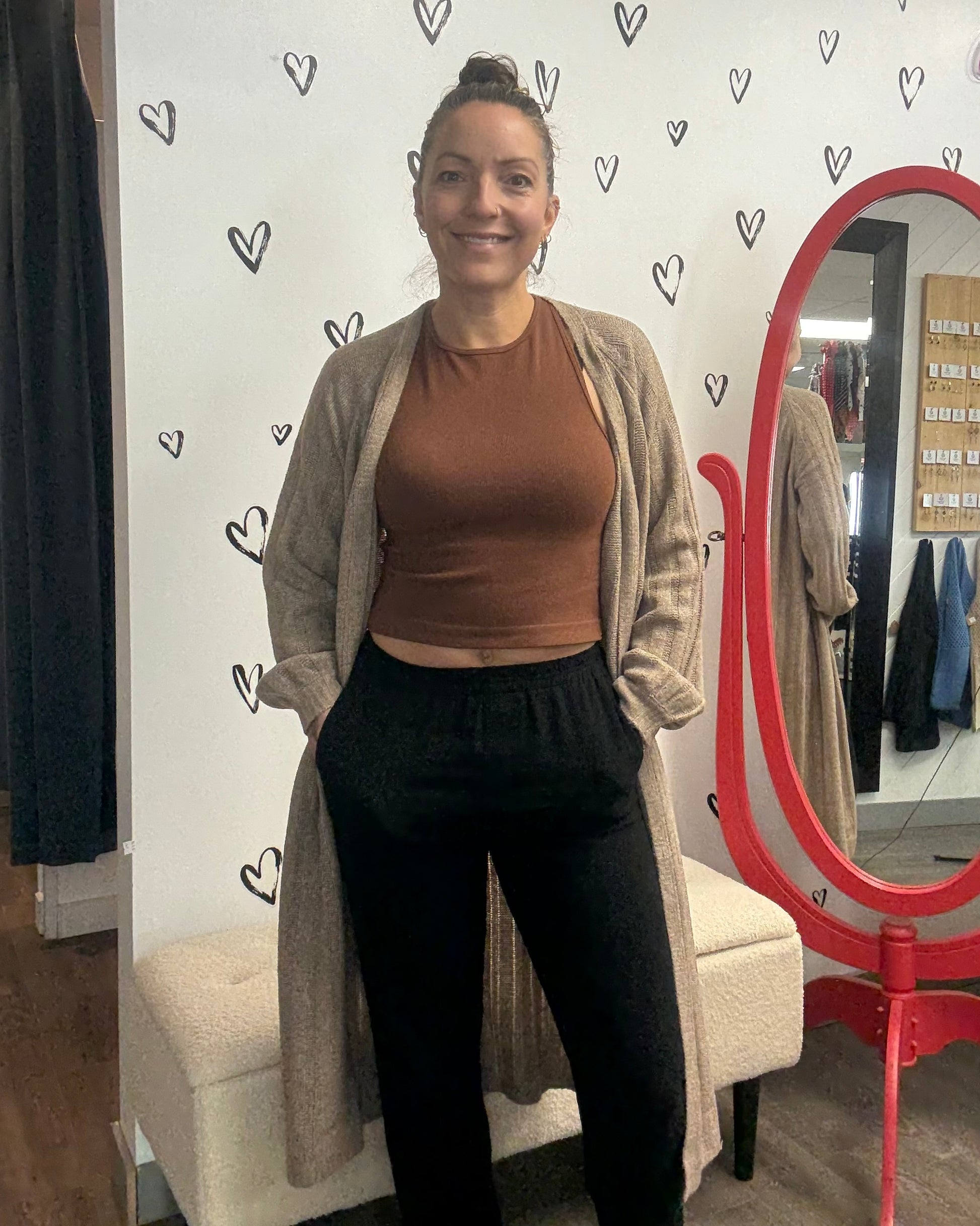 Features: Long sleeve cardigan, shin length, ribbed vertical texture.