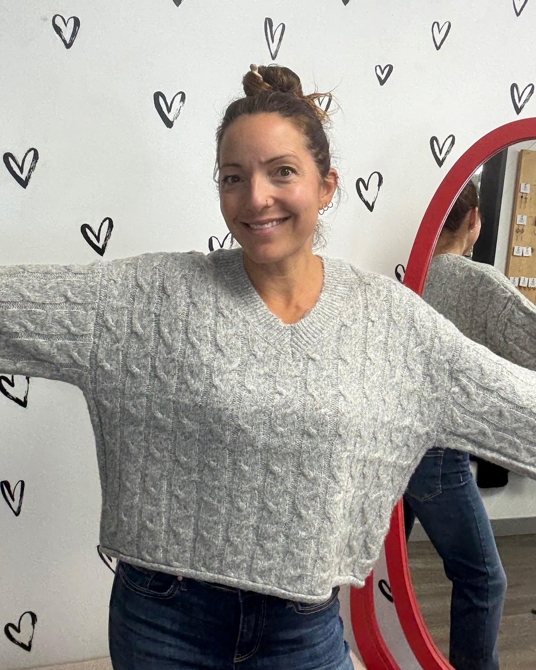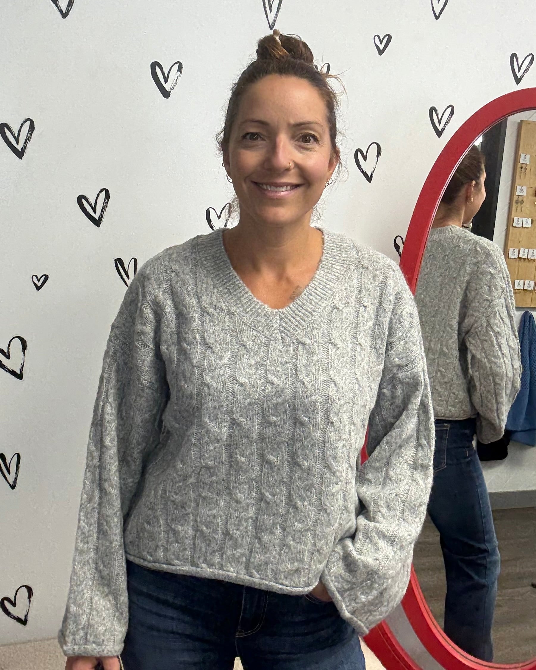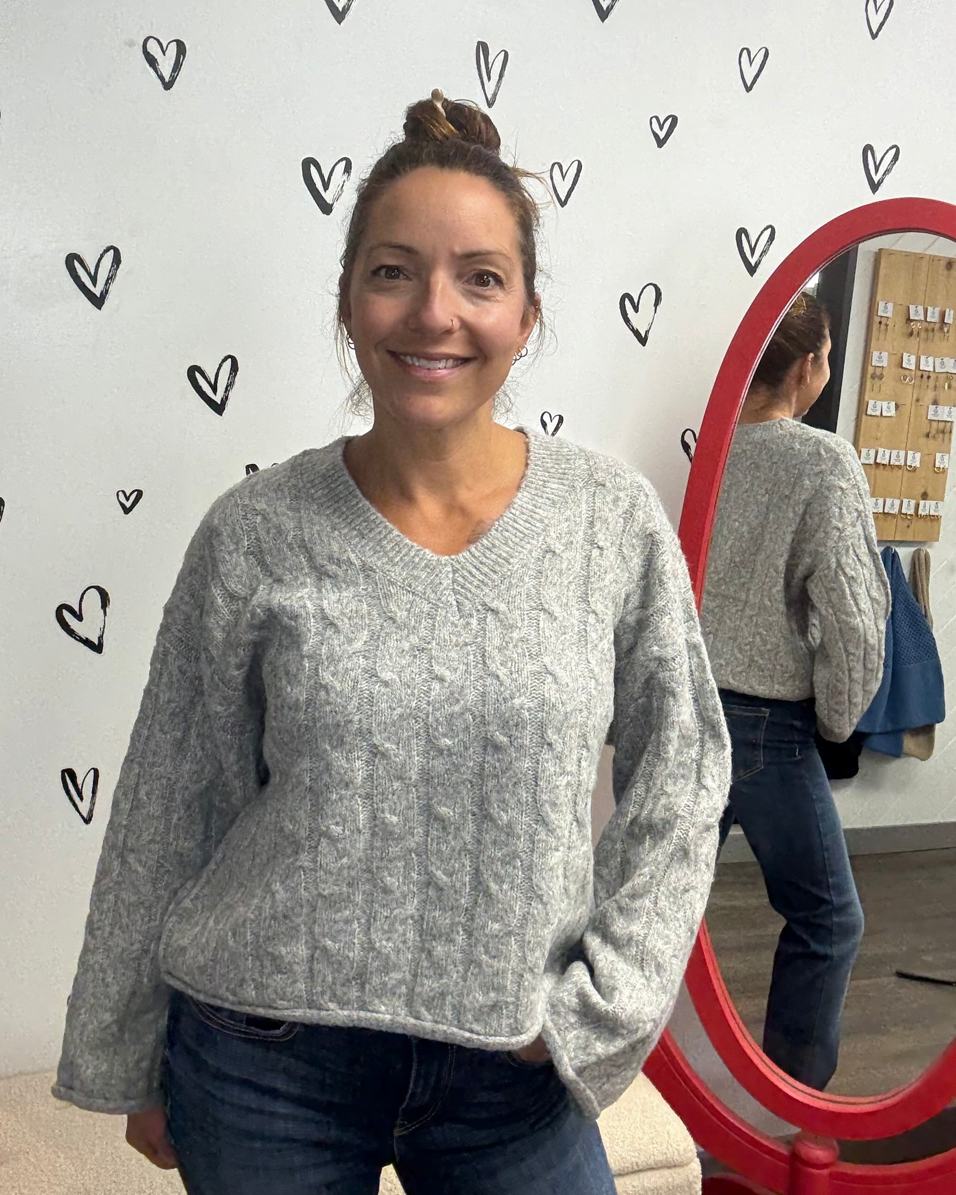 This super soft long sleeve cable knit sweater features a stylish v-neck and wide sleeve design, up-leveling from casual to chic. Pair it with jeans or slacks for an effortless look that’ll keep you feeling snug, and looking fabulous all day long!
