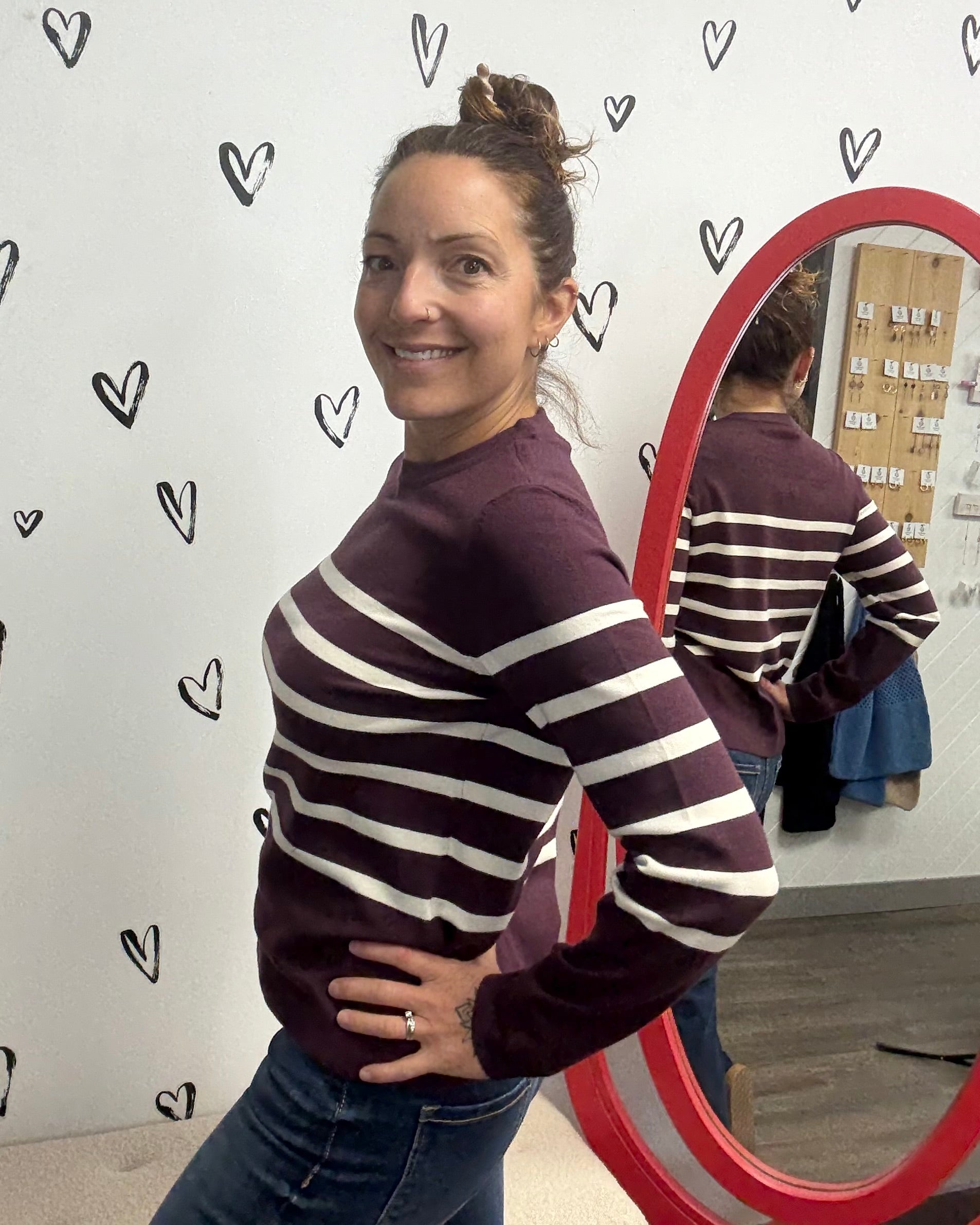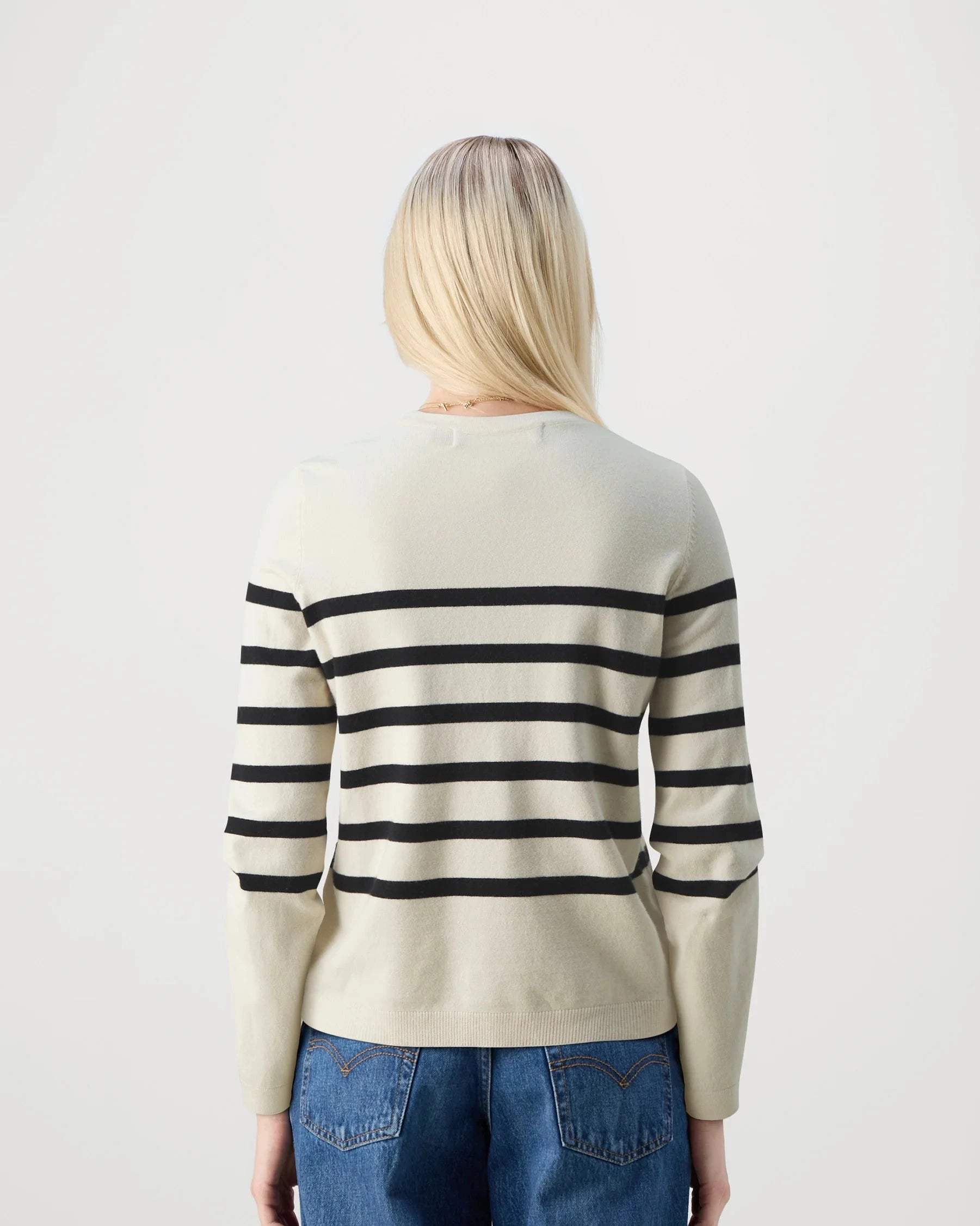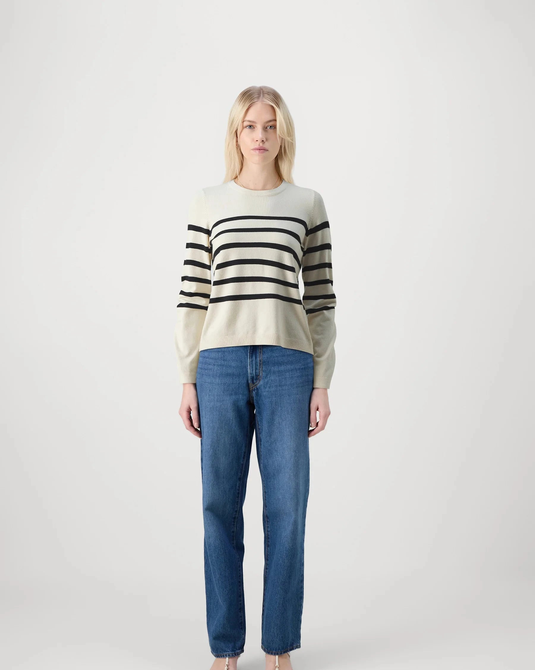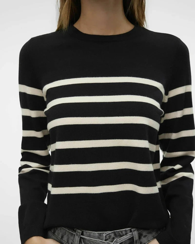 A classic long sleeve knit; the Saba, brings timeless stripes into your everyday rotation. Crafted from a soft blend, it features a flattering crew neckline, full-length sleeves, and a clean, straight hem. Available in three versatile colors, it’s the kind of sweater you’ll reach for again and again—perfect for layering or wearing on its own for a polished, laid-back look.