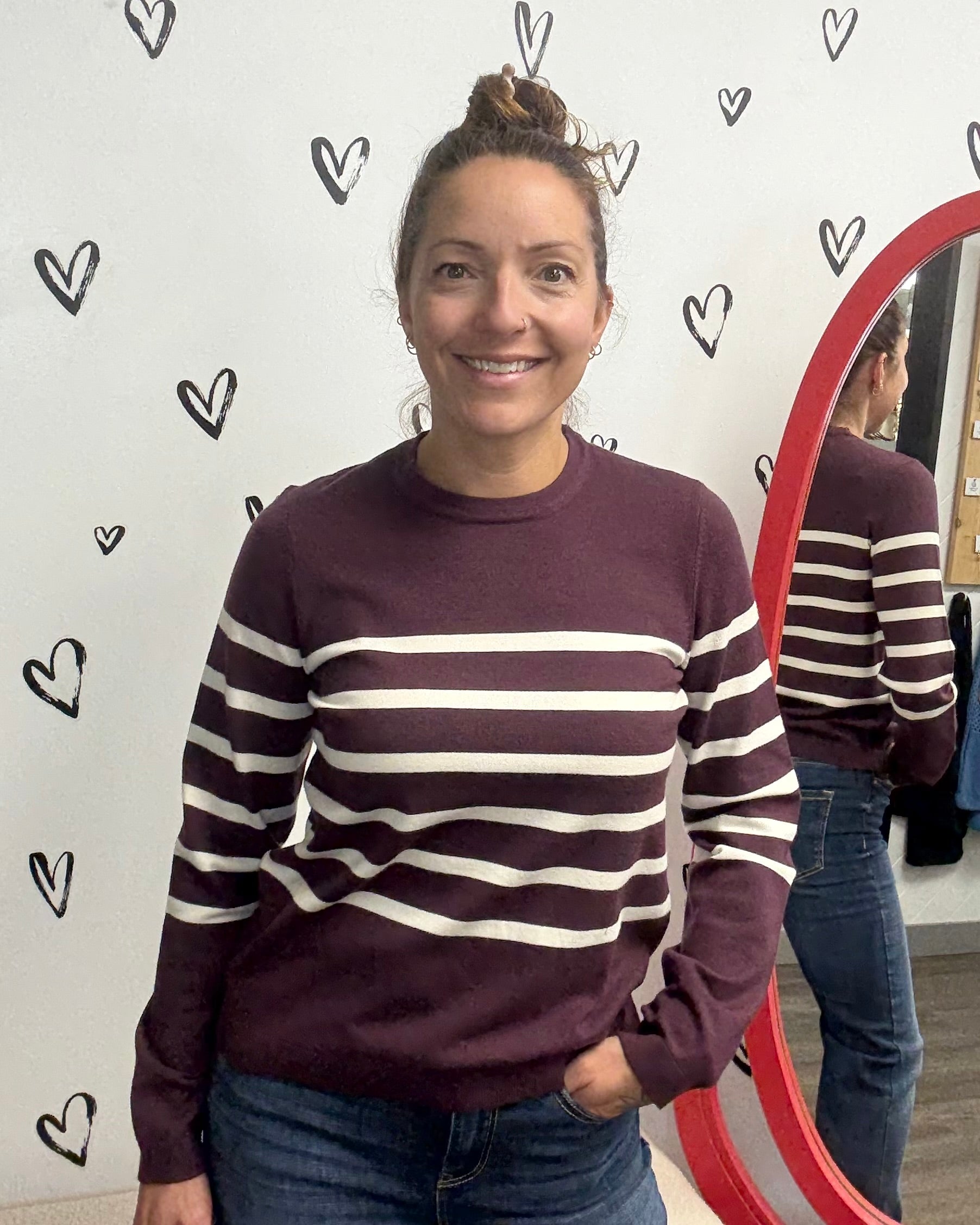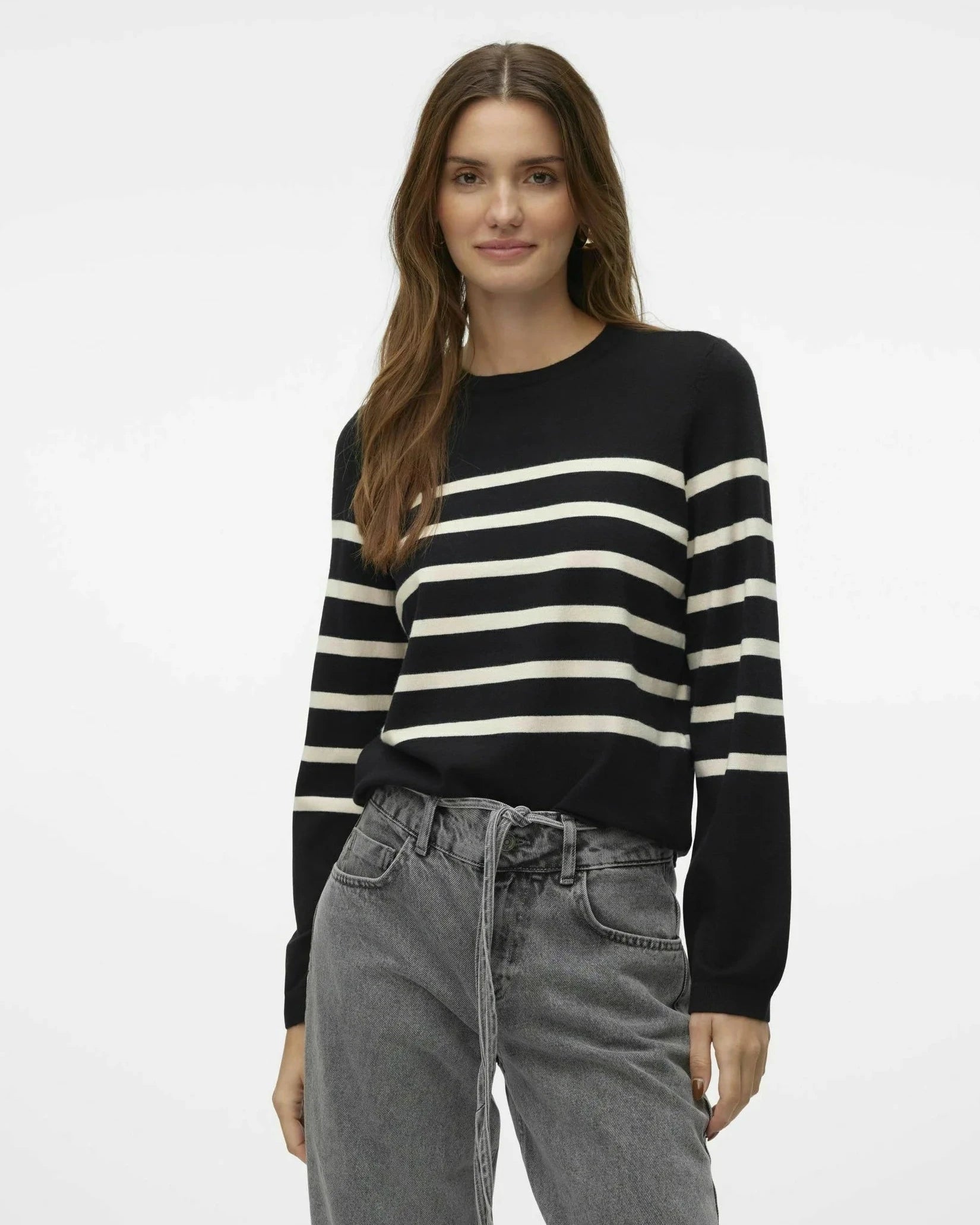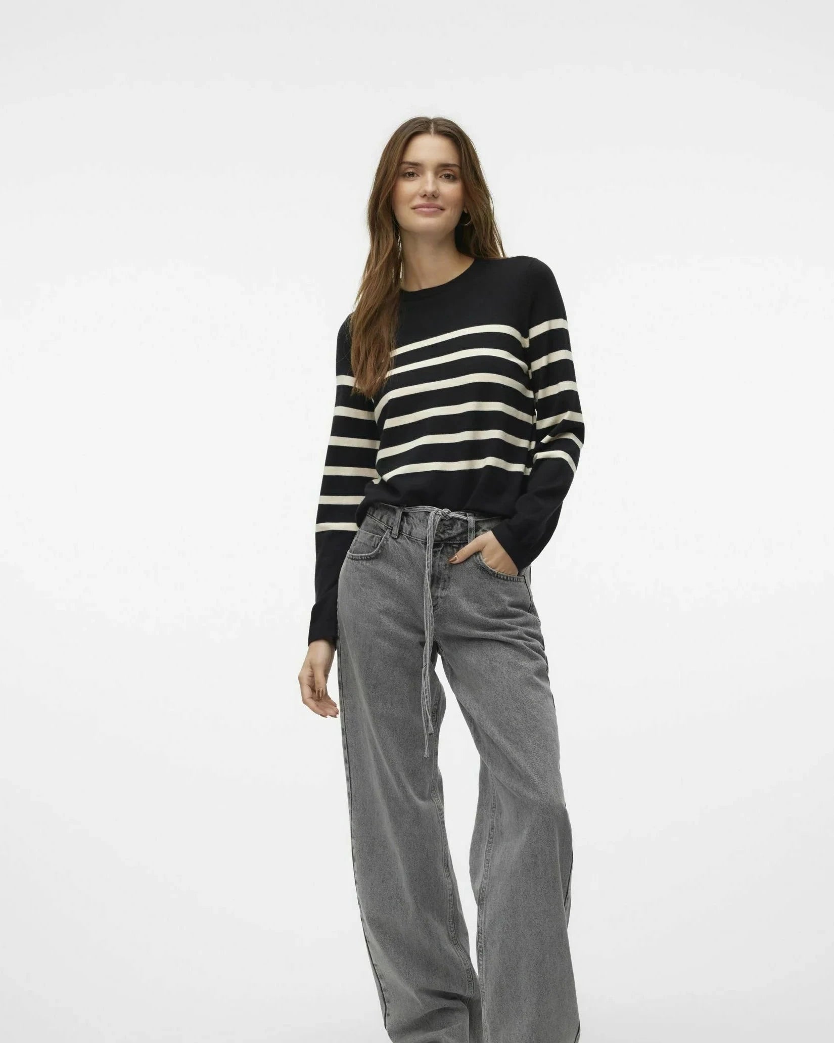 A classic long sleeve knit; the Saba, brings timeless stripes into your everyday rotation. Crafted from a soft blend, it features a flattering crew neckline, full-length sleeves, and a clean, straight hem. Available in three versatile colors, it’s the kind of sweater you’ll reach for again and again—perfect for layering or wearing on its own for a polished, laid-back look.