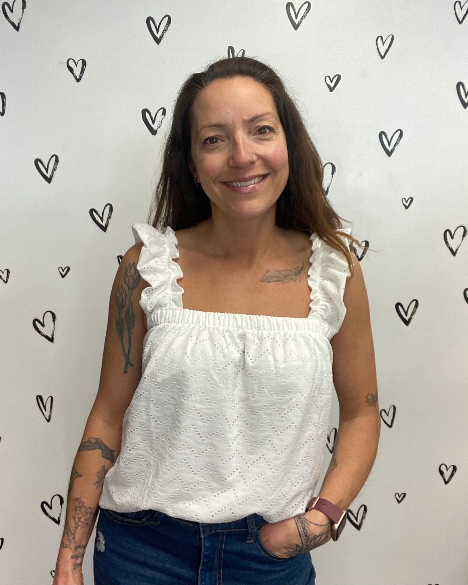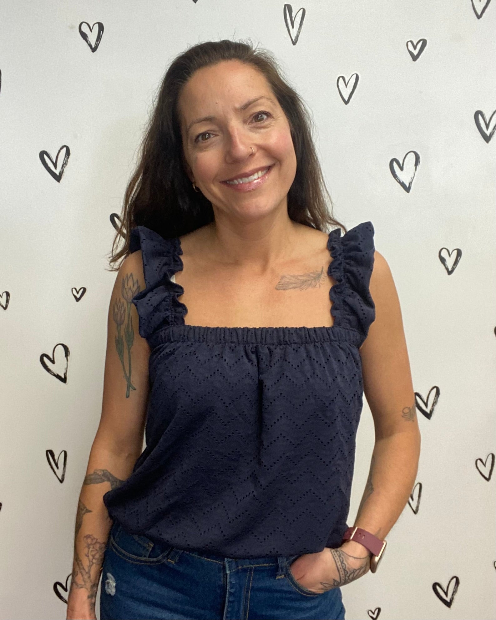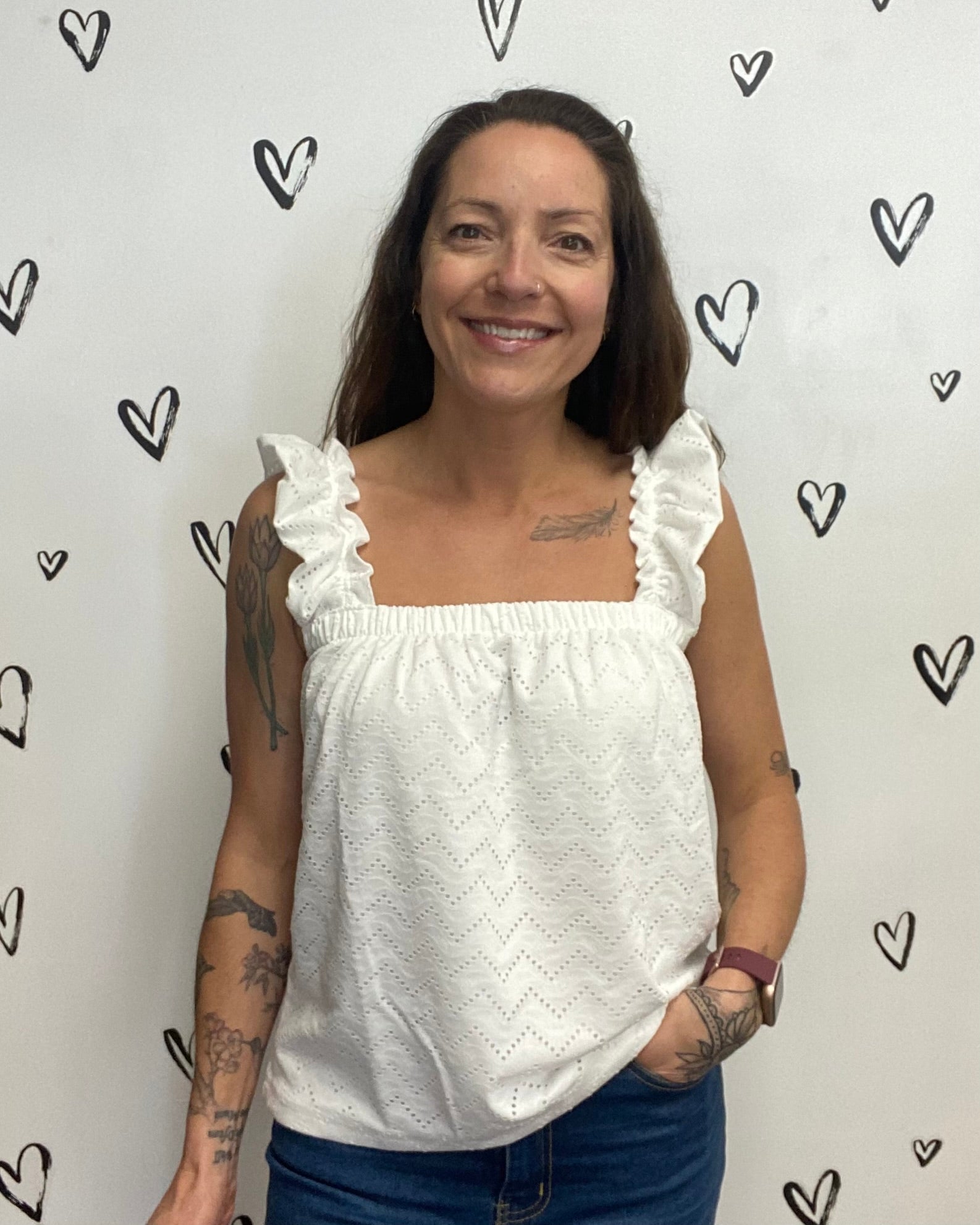 Easy, breezy, and just the right amount of playful - The Thas Top is made for carefree days. The lightweight eyelet fabric and flowy fit keep things comfy, while the square neckline and feminine shoulder ruffles add a touch of charm. Pair it with the matching wide-leg pants or throw it on with your favorite denim for an easygoing vibe. Wear it tucked or untucked, the options are there.